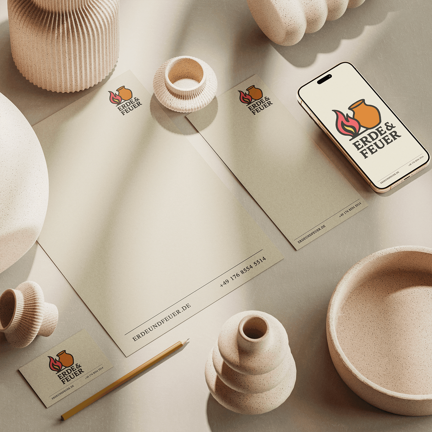 Die Töpferei "Erde & Feuer" aus Cottbus wünschte sich einen klaren, reduzierten Look, der die verbindung von Handwerk, Ton und Feuer wiederspiegelt.